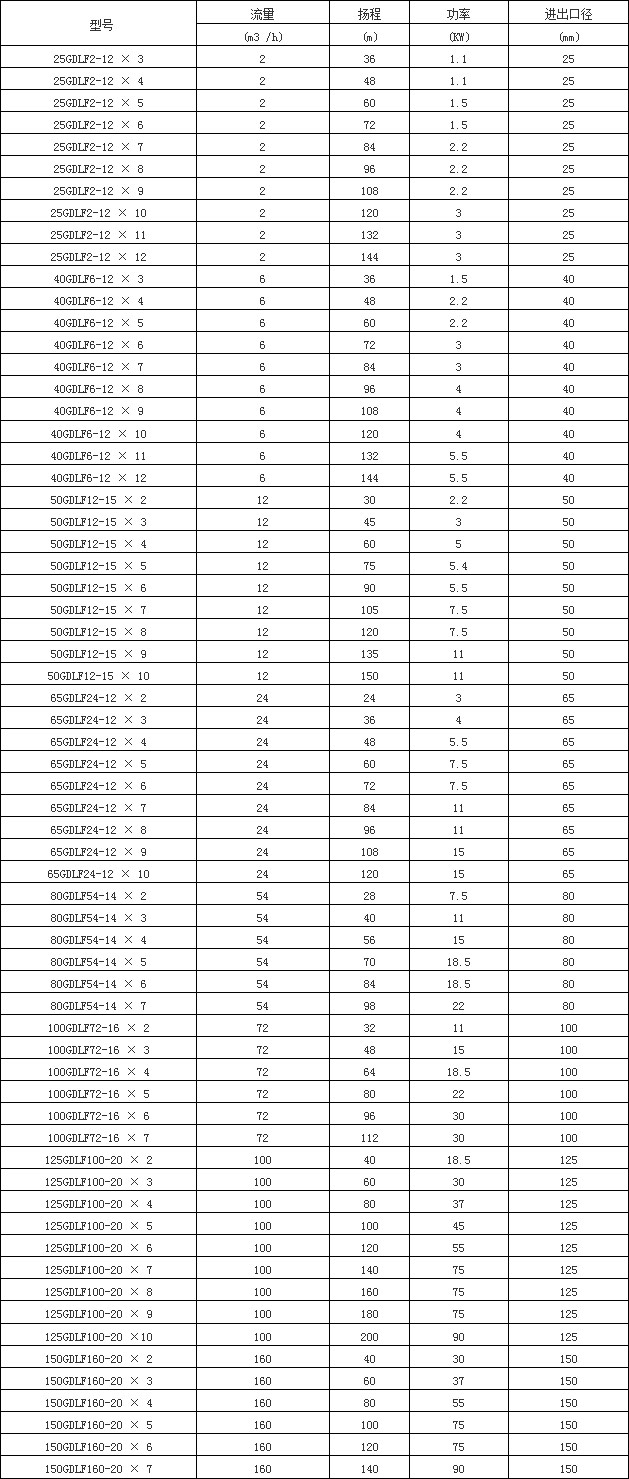 四、GDLF型立式不銹鋼多級管道泵性能參數: